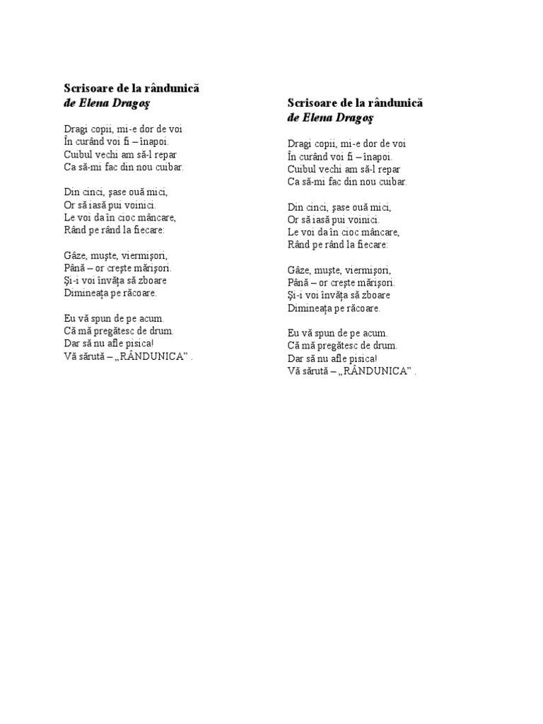 Scrisoare De La Randunica Poezie De Elena Dragos Colectionara De Carti