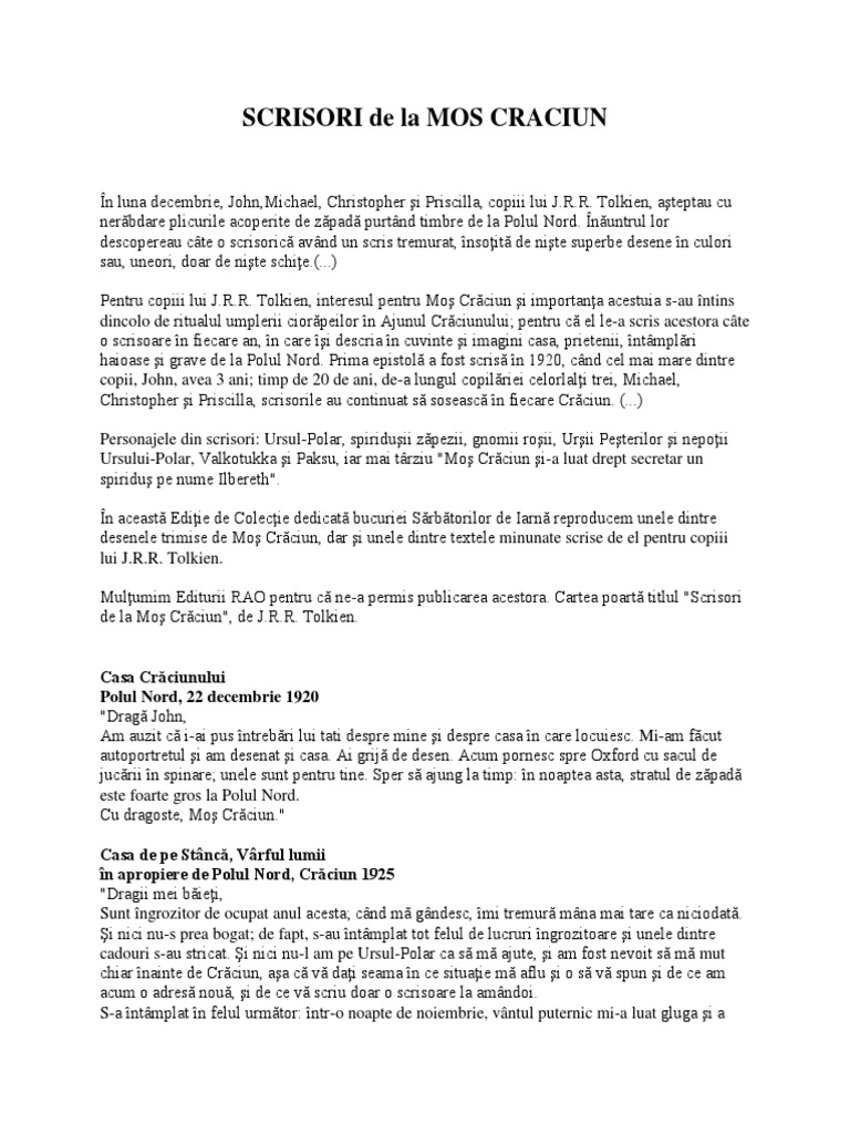 Scrisori De La Mos Craciun De J R R Tolkien Editura Rao